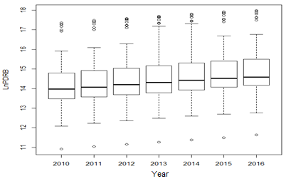 The study uses secondary data from Badan Pusat Statistik (BPS-Statistics Indonesia) and the Directorate General of Fiscal Balance (DGFB), namely the GRDP data of the construction sector as a response variable and four explanatory variables, population size, local revenue, area and the number of construction establishments. The scope of the research data is 119 regencies/municipalities in Java Island over the period 2010 to 2016. The variables used in the study are shown in Table 1.