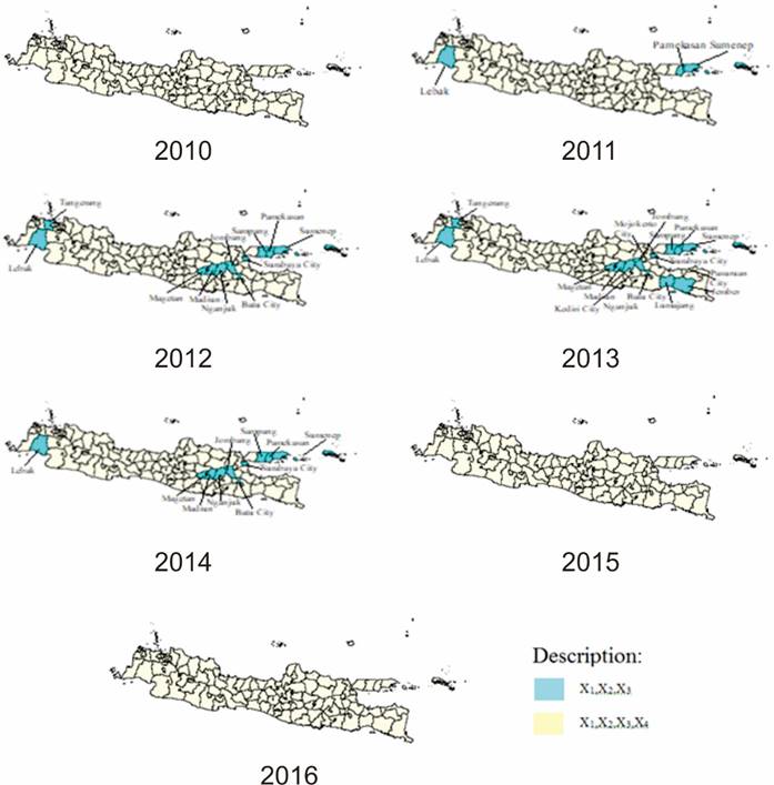 Details of the regency/municipality groupings based on influential factors are presented in Table 6. The table shows that all regencies/municipalities in Java had the same influential factors in 2010, 2015 and 2016. Changes occurred in 2011-2014, when the explanatory variable of the number of construction establishments was not significant in several regencies/municipalities.