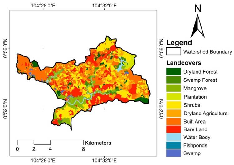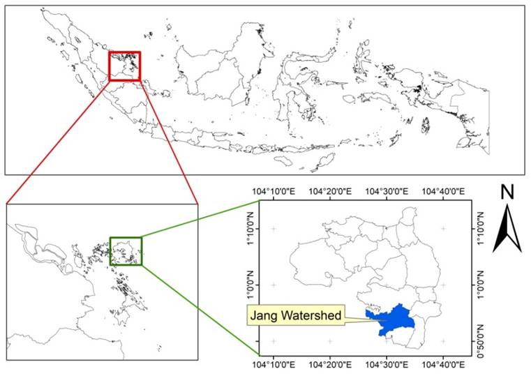 This study was conducted in 2016 in Jang Watershed, Bintan Island, Kepulauan Riau province, Indonesia. Jang Watershed covers an area of 7910 ha, extending from 104°26’14” to 104°35’0” East longitude and 0°50’38” to 0°56’50” North latitude (Figure 1). Based on Schmidt and Fergusson’s classification, the climate type is A with a Q value of 0 % (Adi & Wijaya, 2016). Mean annual rainfall is 3243 mm and mean monthly rainfall exceeds 200 mm with no dry months (Adi & Wijaya, 2016). The elevation of the study area is 0–212 m above sea level and the land is characterised by flat to very steep slopes ranging from 0 to 52%.