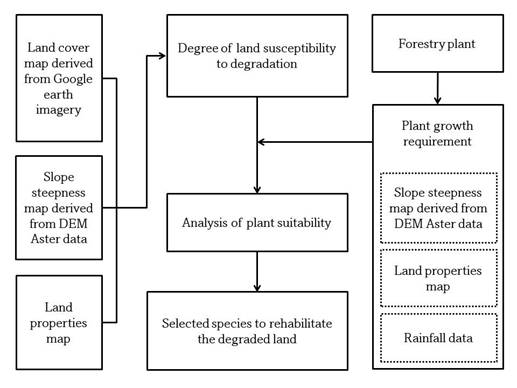 The recovery of degraded land through rehabilitation activities has been conducted for several decades; however, land degradation is still continuously taking place. This may be the result of a lack of integrated information on both land sustainability versus degradation and the species that are suitable for its rehabilitation. It is necessary to spatially classify the susceptibility of land to degradation in order to determine the priority in which to rehabilitate degraded land (Basuki & Wahyuningrum, 2014). This classification can be conducted by analysing the properties of land obtained using remote sensing data (Basuki & Wahyuningrum, 2016). These spatial data are essential in order to delineate degraded land (Tarigan, 2012).