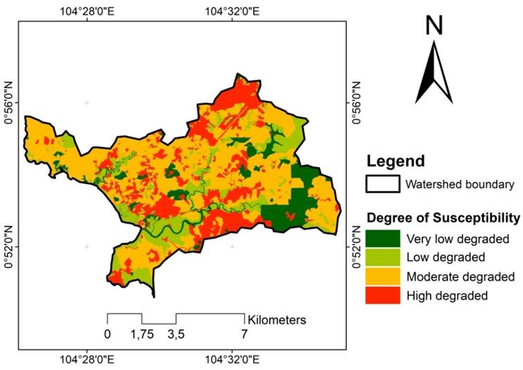 Further analysis was undertaken to integrate the preliminary maps and the data from the field campaign. The resulting data were evaluated and classified based on Table 2. A number of previous studies have also applied this method in their efforts to identify the level of land degradation within the Tapan Micro Catchment in Karanganyar Regency (Basuki & Wahyuningrum, 2014), Upper Solo Sub Watershed in Wonogiri Regency (Basuki et al., 2016) and the Oyo Sub Watershed in Bantul Regency (Widya, 2015). The method was adopted here due to its ability to detect the potential of the degradation areas and also the occurrence of land degradation earlier. This is important because the dynamics in the watershed occur continuously due to both natural and human factors.