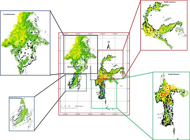 Conversely, the area in the eastern part of the Makassar Strait has more rain gauges than in the western part. Validation showed that the volume of modelling data was proportional to accuracy, especially using the IDW method. The 5% or 10% portion samples were almost always better than larger sizes. However, the number of overestimates in South Sulawesi is higher than in Central Sulawesi, but the number of hits in South Sulawesi is higher than in Central Sulawesi. Moreover, the best evaluation portion sample for IDW modelling should be no more than 25% and 5% - 10% in Central and South Sulawesi respectively.