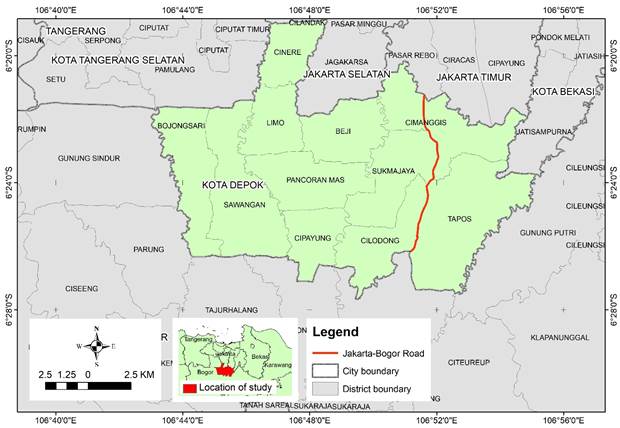 The corridor of the Jakarta Bogor highway industry is a centralized area of industrial activity that is not regulated in single management, such as an industrial estate. It was growing with various industrial activities due to the attractiveness of the location. It also was once a very strategic suburban of Jakarta for industrial activities, namely the accessibility of roads and other industrial support facilities. It was not surprising that every year before the availability, this area has a great demand for the establishment of industrial sites. The research area is a segment within this corridor that was included in the Sukmajaya District administration as below (Figure 1). Land development in the segment of the industrial corridor in Sukmajaya that included in the study area was mostly for economic activities and settlement areas. The rapid development of industry has influenced socio-economic services growth, such as shops, settlements, educational, and health facilities in this area.
