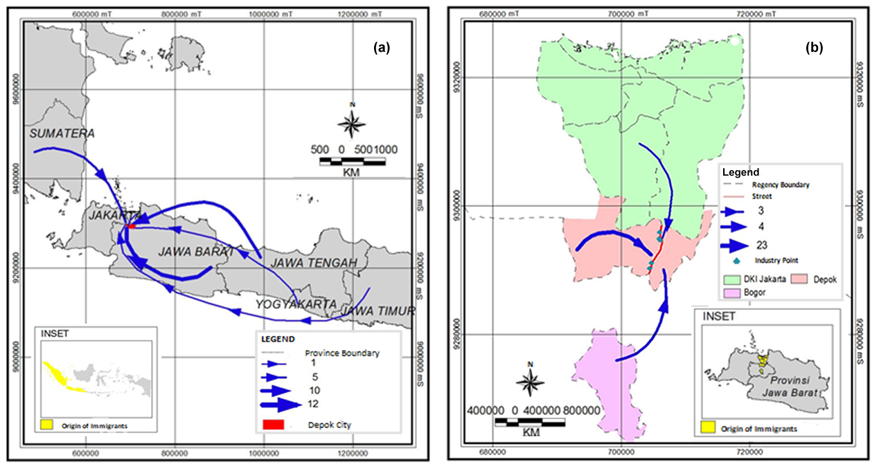 West Java Province, which has adjacent administrative boundaries and has relatively proximity to Depok City, has the highest number of female industrial workers, who perform circular migration (Figure 2a). It indicates that circular migration is carried out by people who have migrant origin areas at a short distance, followed by migrations from Central Java and East Java Provinces.
