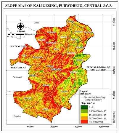 The Kaligesing slope map (Figure 2) shows that the physiographic conditions of Kaligesing District are very heterogeneous in each village. The dominant slope is that classified above 15%; slope classes are often found in the 15%-25%, 25%-45% and> 45% ranges. Slope domination was performed by visual judgement interpretation in each village. Kaligesing district has heterogeneous slopes, which mean it will also affect other conditions represented on the following map. Steep slopes dominate the district. This means much land cover in the form of forests is included in the non-agricultural area category.
