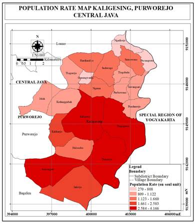 The population map (Figure 3) shows that there are four villages in the west and south which are bigger than the other villages and have the highest populations, in the of range 2,584 – 4,166 (classification five). These villages were Kaligono Village, Tlogoguwo Village, Donorejo Village and Somongari Village. Other villages in the north and east have smaller population patterns and populations that are not so high. The condition of the population can also be seen from the slopes which tend to be sloping (see classification in Table 1) and used as a settlement, so that there are many people living in the village.