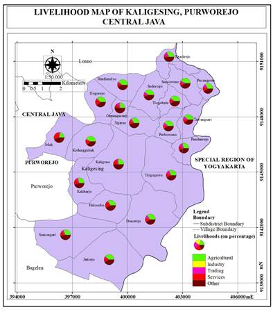 The livelihood distribution map was also based on secondary data obtained from Kaligesing district government, with the mapping unit also at village level. The secondary data on livelihood were sorted based on the village and livelihoods of the population. Many secondary data on work types were obtained from the Kaligesing government, so the type of livelihood could be classified into several classes in each village (Table 1). The livelihood data for each village were then represented in a diagram showing the types and number of livelihoods of the residents living there.