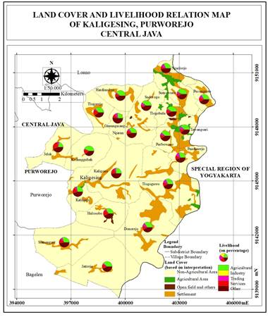 The relation between the land cover map and livelihood map (Figure 6) was made with the aim of being the main reference for a region's potential. The relationship between the two aspects shows that in Kaligesing District, which is dominated by non-agricultural areas, the highest percentage of a population’s livelihood is in the agricultural sector. This is due to the limitations of the classification used. Land cover, which is intended as non-agricultural areas, includes forests or plantations. These dominate Kaligesing district due to the physiographic conditions described earlier. The scale used as a reference for interpretation is not able to cover all the land cover classes. Livelihood classification limitations are also limited by the population livelihood class in agricultural sector. The class must include farmers, planters and farm workers at the same time. The reality encountered at the time of interpretation was that the agricultural area could only be included in the rice field classification.