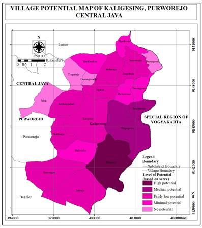 The village potential map (Figure 7) are arranged based on an overlay of the four thematic maps. Modeling of the thematic maps into village potential maps was based on predetermined classification and weighting (Table 1). The highest weight was 200 and the lowest 60. Donorejo village is the only one included in the high potential village classification, followed by Pandanrejo and Tlogoguwo, which were included in medium potential classification. These villagess are directly adjacent to the Special Region of Yogyakarta Province in the east. Other potential villages (classification three) show a linear pattern from north to south in Kaligesing District. In addition, other surrounding villages are included in the fairly low potential village classification, namely Jelok, Tlogorejo, Gunungwarigi and Pucungroto. These villages are bordered by other sub-districts in Purworejo, while Pucungroto village is included due to natural boundaries directly adjacent to areas with high slopes in Special Region of Yogyakarta Province.