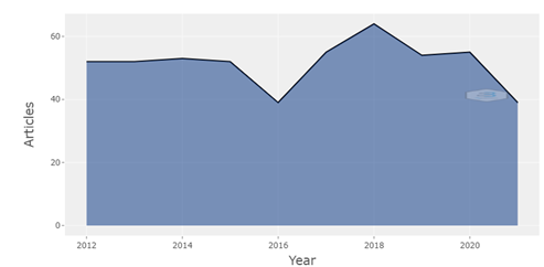 Figure 2 presents the development of conceptual change studies over time. During the 2012-2021 period, the number of articles was at a relatively constant number of approximately 50 articles. The highest number of article productions occurred in 2018 with a total of 64 articles. Subsequently, a decrease in the number of article production was observed in 2016 (n = 39) and 2021 (n = 39).