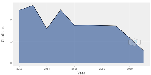 Of the 1,254 authors recorded within the documents, 135 published at least two articles on conceptual change research in the 2012-2021 period. In addition, 27 authors published three articles, 6 published four articles, and 8 published five or more articles. In other words, almost all authors only published one article between 2012 and 2021. Each published article was cited an average of 11.37 times. Each publication received approximately 0.80 citations per year on average. The average article citation per year is presented in Figure 3.