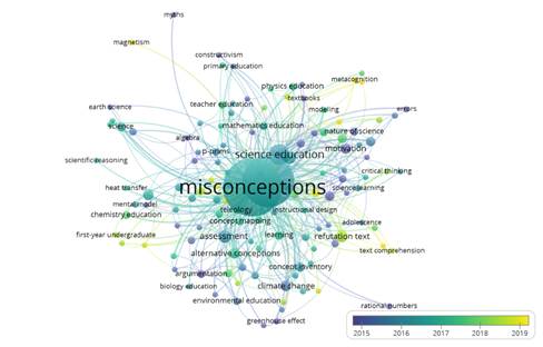 The sequential shift of conceptual change research theme was further explored by converting Figure 6 into an overlay visualization. The VOS viewer software calculated the average publication year based on the publication year of the articles, which was then linearly transformed into a scale ranging from 0 to 1 represented in colors. Figure 7 shows the corresponding overlay visualization.