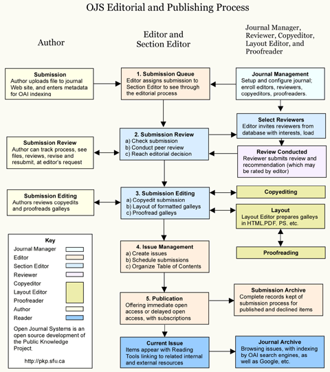 - Editor: Oversees editorial process; can assign submissions to Section Editors to see through Submission Review and Submission Editing; undertakes scheduling of content and publishing of journal.